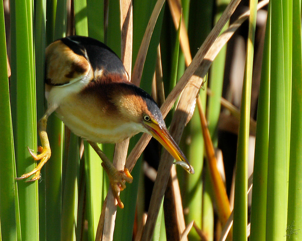 The Least Bittern’s scientific name is Ixobrychus exilis. Ixobrychus is from Ancient Greek ixias, a reed-like plant and brukhomai, to bellow. Exilis meaning little, slender.