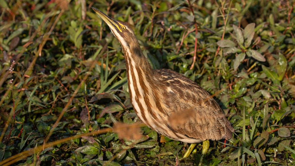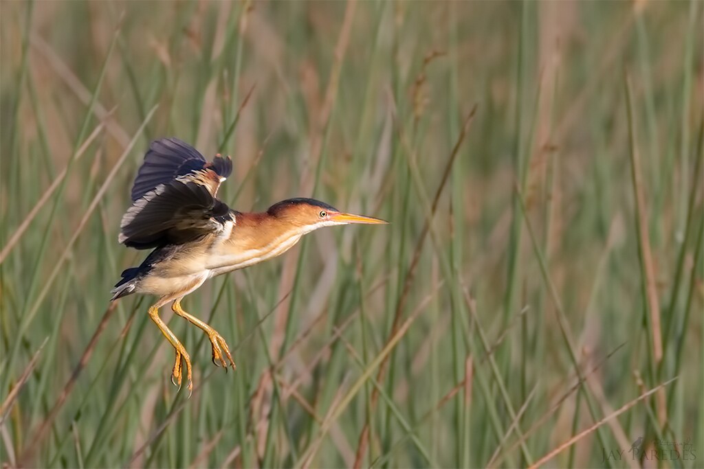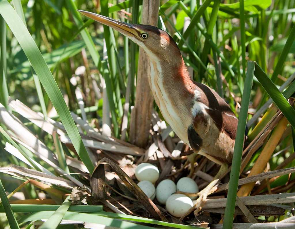 With 16 species of Bitterns worldwide, the Least Bittern is one of the smallest herons in the world. They’re stylishly attired in hues of chestnut, cream, and black, with the male more ornately colored than the female. Because of its habitat choice, it often goes unseen except when it flies, but its cooing and clucking call notes are heard frequently at dawn and dusk and sometimes at night. Like other bitterns, they eat fish, frogs, and similar aquatic life.