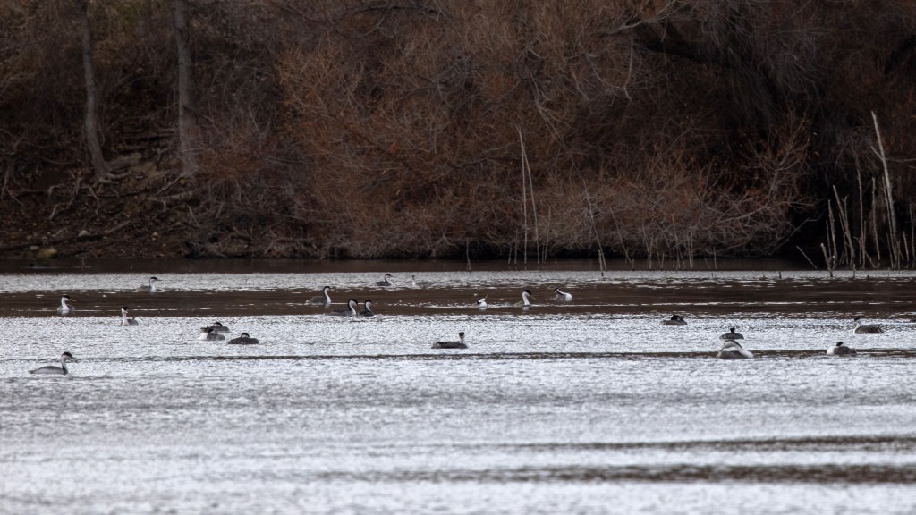 I was amazed at the number of Aechmophorus grebes hanging out around all coves and inlets of the reservoir. Aechmophorus refers to the genus name of Western and Clark’s Grebes that used to be conspecific until their split back in the late 80s. A quick count using my telescope of the birds I could see gave me a total of a little over 300 birds with the ratio of Western to Clarks at about 10:1.