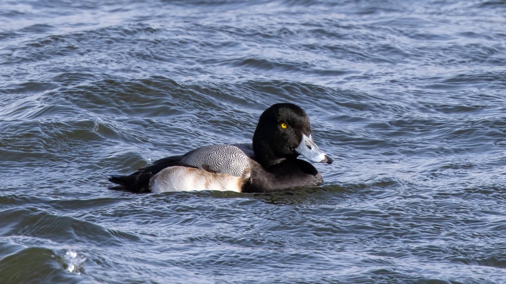 After checking off the Horned grebe on our eBird Mobile checklist, we focused on the many Scaup flocks, hoping to ID a Greater in with the Lessers. Greater Scaup are similar to Horned Grebes in that they are more usually found along the coast. The one spot they seem easier to find though is exactly where we were.