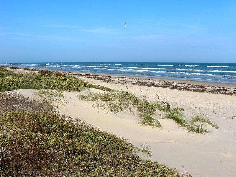 Most of the seashore is accessible only by four-wheel-drive vehicle. The Gulf beach is composed of white sand and is less than a hundred feet wide.Bordering the beach is a narrow dune ridge running almost the length of the entire island. West of the dune ridge are the grasslands and marshes. Few trees exist on the island. Those that do are mostly mesquite, live oak, or willow. On the western shore of the island are extensive mudflats.