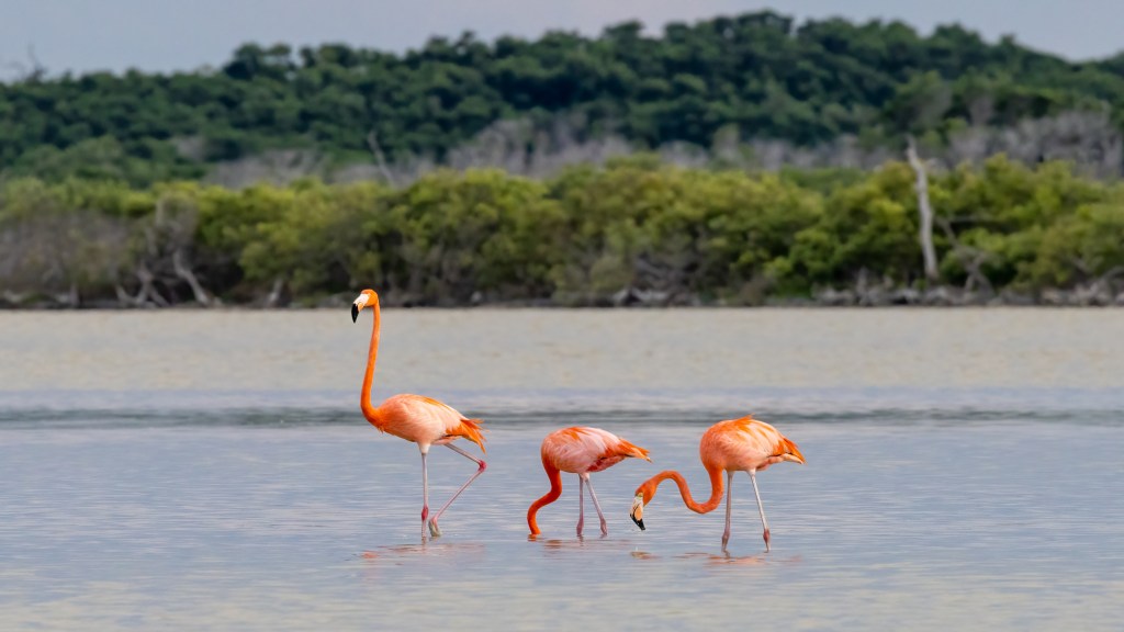 Cuando doblamos una curva, el paisaje se abrió y ante nosotros en la distancia había una veintena de pájaros vivos #700, también conocidos como FLAMENCOS AMERICANOS.