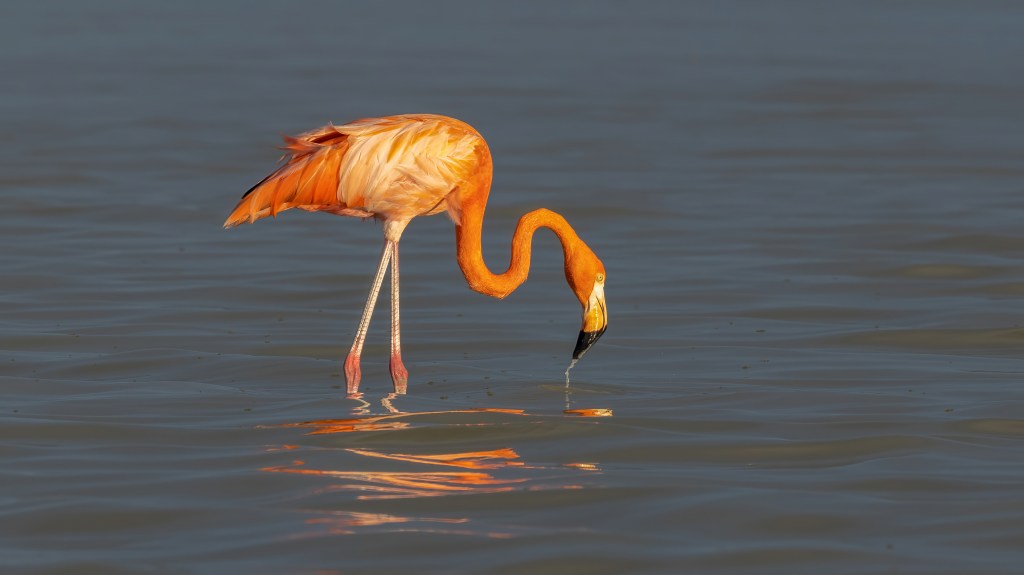 En ese momento, el sol comenzaba a ponerse bajo en el horizonte bañando a los flamencos en una cálida luz brillante.
