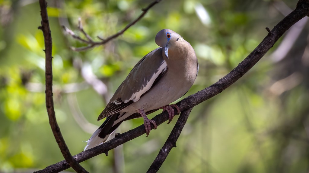 I overheard someone mention RUDDY GROUND DOVE out in front and we took off to try and see it. This would be an American Birding Association area bird, though not a lifer as I had just seen many in the Yucatan last January. The docent got us on the calling female just across the wash and he got a scope set up so we all could see it clearly. This is a rare, but regular species overall in SE Arizona, but has been seen regularly here of late. It was not possible to get photographs of the distant female, but as luck would have it, a male appeared in the trees right next to the feeders and I managed a decent shot.