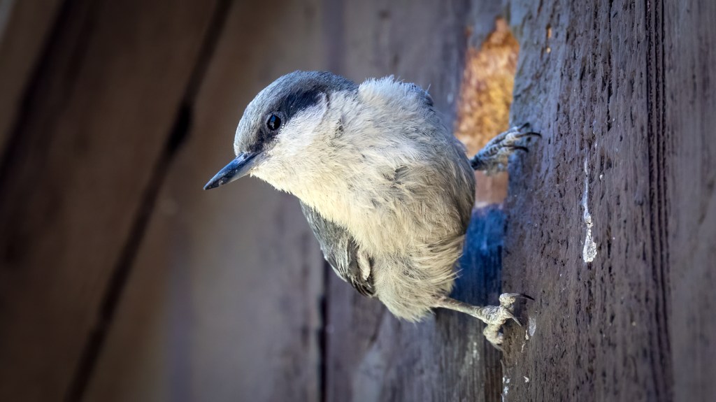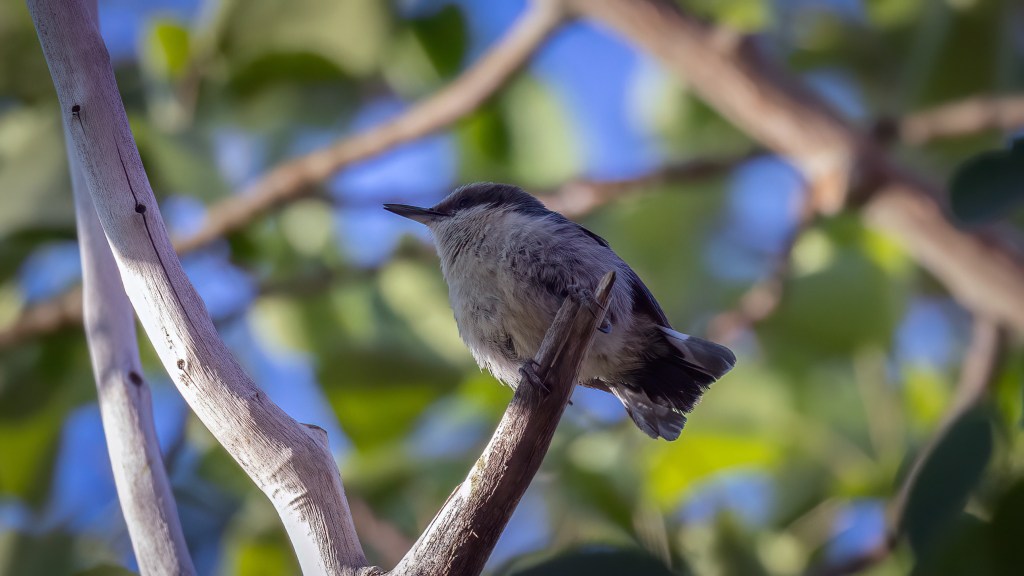 While I was waiting for Rich to fill up the ice chest, I wandered outside of our parking garage to take a photo of our hotel, the Sierra Lodge, with the magnificent backdrop of the Sierra Nevada. I crossed the street to get the best angle and immediately got distracted by the chatter of a Pygmy Nuthatch that was flitting around the trees right next to our hotel. I yelled to Rich to grab his camera and we proceeded to follow not one, but two Pygmy Nuthatches as they bounced around in constant movement between the trees on each side of the road.