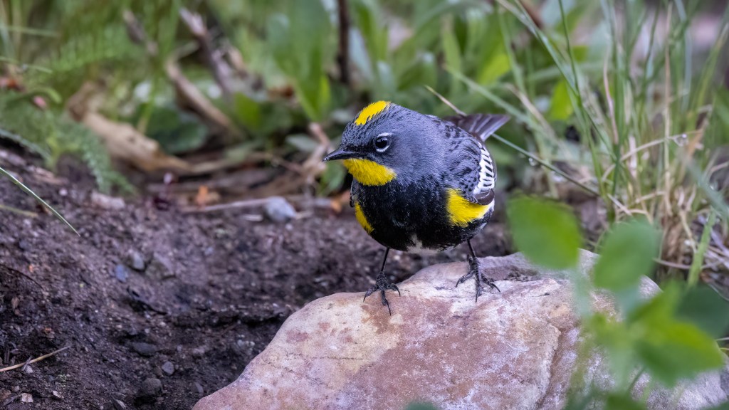 As we watched the nuthatch, an inquisitive Yellow-rumped Warbler flew down from the trees and landed on the ground right next to us.
