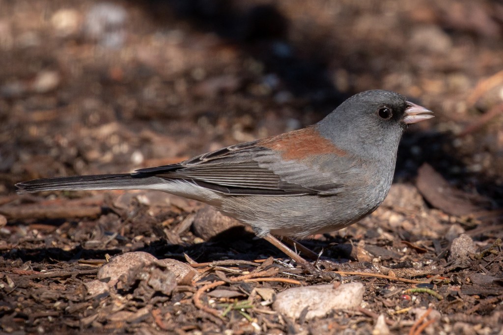 Some of the other forms (sub-species) of Dark-eyed Junco that may appear from time-to-time in the Central Valley include the curious all gray with a white belly Slate-colored Junco or the reddish-backed Gray-headed Junco. In SE Arizona there is a completely different species called the Yellow-eyed Junco that looks like a Gray-headed, but with yellow eyes.