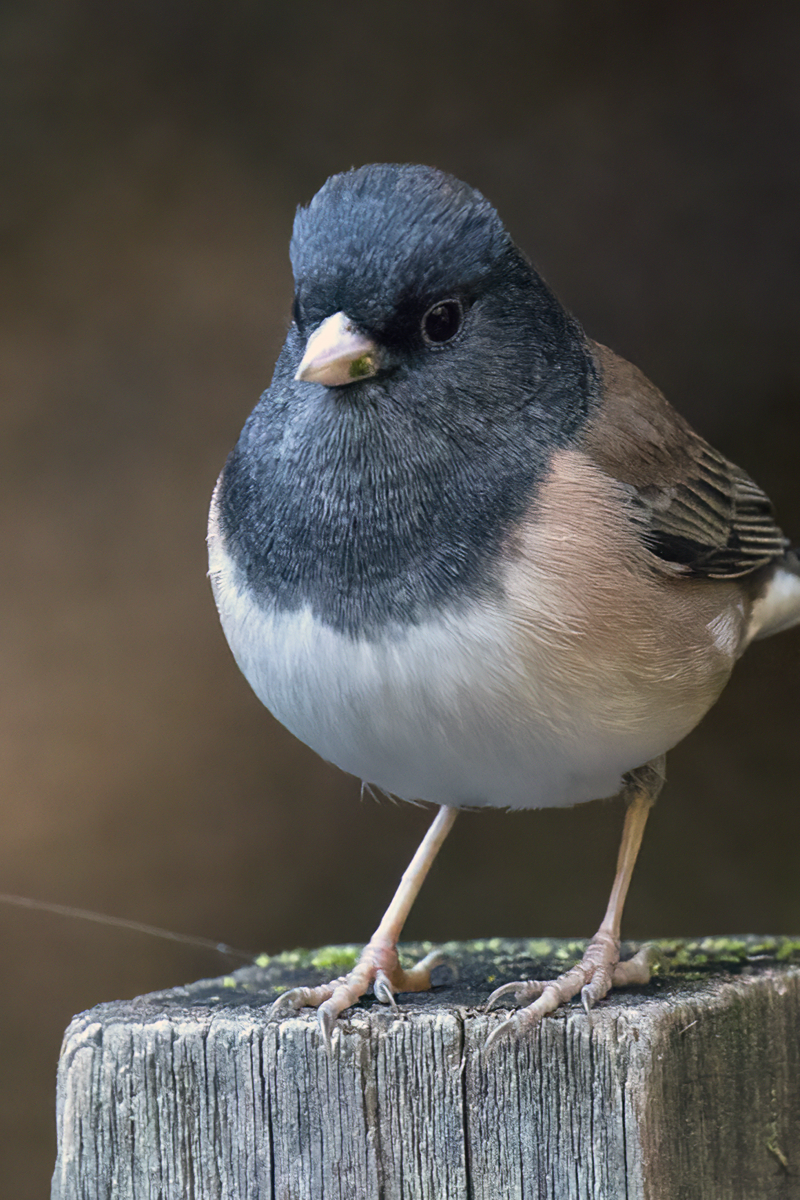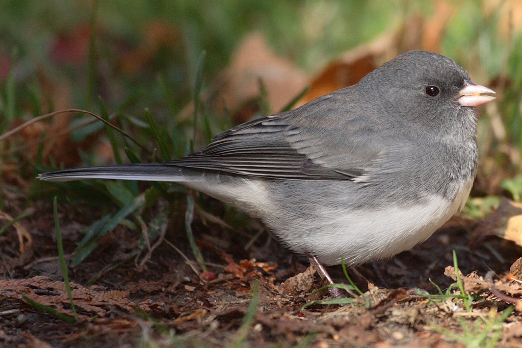 While there are several different forms (sub-species) of Dark-eyed Junco in the US, the form known as the Oregon Dark-eyed Junco is our most common form. The adult male “Oregon” Dark-eyed Junco is easily identified by its all-dark head and brown back, pale bill, white belly and white outer-tail feathers. The white outer tail feathers flash distinctively in flight and while hopping on the ground.