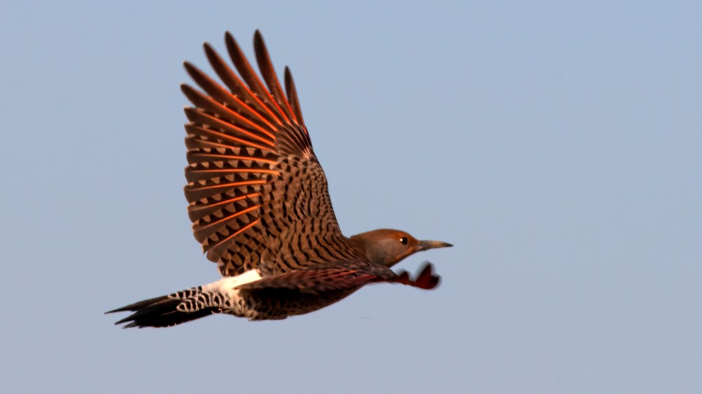 This brownish-gray woodpecker, larger than an American Robin, has a black-barred back and is spangled below with black polka-dots. Easily recognized as it springs into flight, the flicker flashes a large white rump patch and bright red-colored wing linings and tail feather shafts.