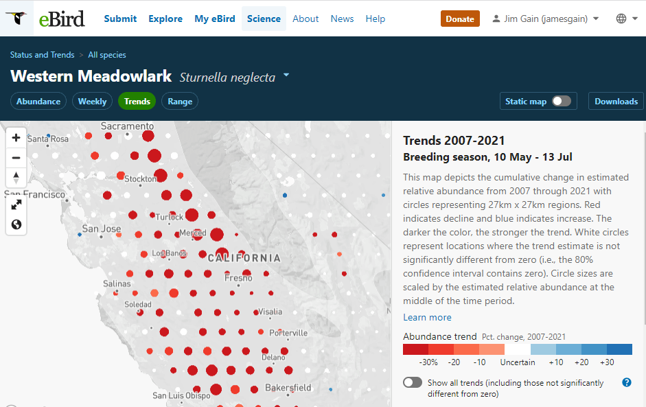 Although Western Meadowlarks are numerous, their breeding populations declined approximately 0.9% per year between 1966 and 2019, resulting in a cumulative decline of about 37%, according to the North American Breeding Bird Survey.