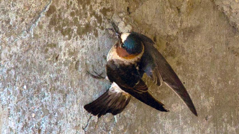 The Cliff Swallow (Petrochelidon pyrrhonota) is a migratory bird species that is found in the Central Valley of California during the breeding season, typically from March to September. They are known for their unique mud nests that they build on vertical surfaces such as cliffs, bridges, and buildings. These nests can be quite large, sometimes housing hundreds of birds, and are a common sight in many areas of the Central Valley.
