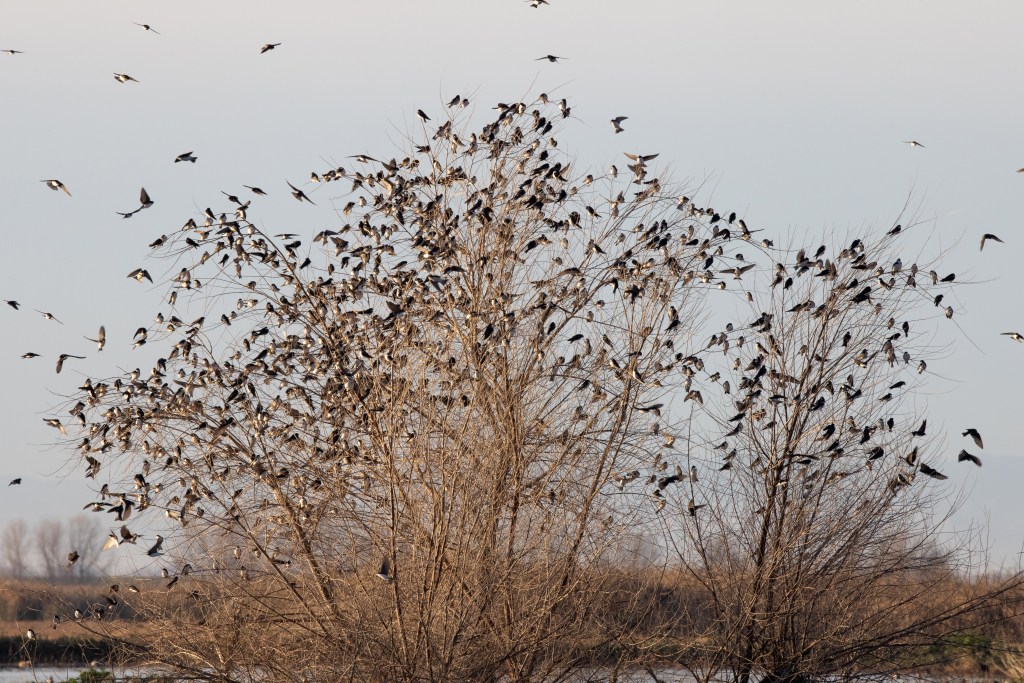 Tree Swallows are migratory birds that breed in North America, with some populations wintering in Central and South America. They typically arrive in the Central Valley of California in late February or early March and start breeding in April. These birds are cavity nesters, and they often compete with other species, such as Bluebirds and House Sparrows, for nesting sites. They build their nests in tree cavities, birdhouses, and even nest boxes provided by humans. Tree Swallows lay 4-7 eggs per clutch and raise 1-2 broods per year.