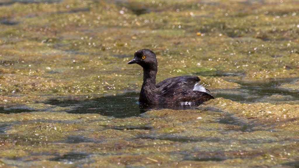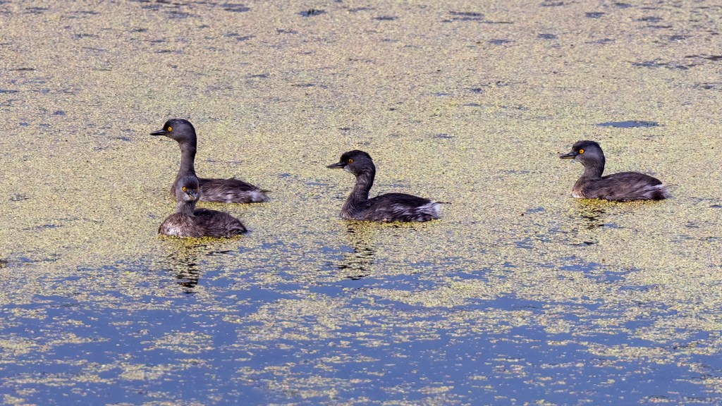The Least Grebe (Tachybaptus dominicus) is a small waterbird that inhabits freshwater wetlands throughout the Yucatan Peninsula. They are primarily found in shallow water bodies, such as ponds, marshes, and slow-moving streams, where they can easily dive to catch prey such as fish, insects, and small crustaceans.