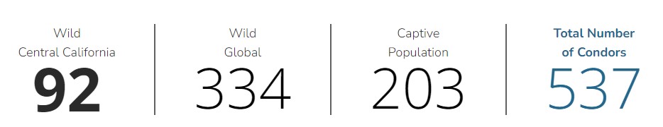 In the Central Coast area of California, three primary recovery and release facilities have been established at San Simeon, Big Sur and Pinnacles National Park. The condor population has gradually grown to 537, as of the last official count in December 2021. Of them, 334 are free-flying.