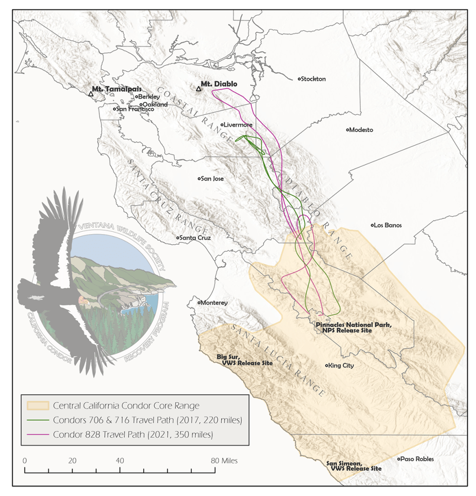 September of 2021, condor 828 took an even longer roadtrip and flew to the edge of Mt. Diablo. Both visits to the Bay Area likely included other condors that weren’t fitted with GPS tracking, since condors often travel in groups, says Ventana Wildlife Society head condor biologist Joe Burnett.