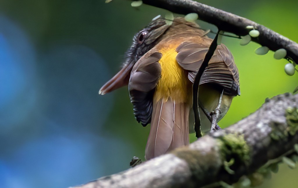 These birds inhabit a variety of forested habitats, including secondary growth forests, forest edges, and scrubland. They are known for their loud, melodious calls, which can often be heard echoing through the forest canopy. Bright-dumped Attilas primarily feed on insects, which they catch on the wing or glean from foliage.