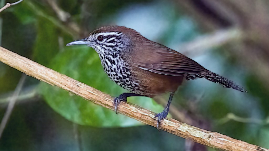 The Spot-breasted Wren (Pheugopedius maculipectus) is a small, brown-colored bird that inhabits the dense undergrowth and thickets of the lowland forests of Belize. They have a distinctive white throat and breast speckled with small, dark spots, which gives them their name.