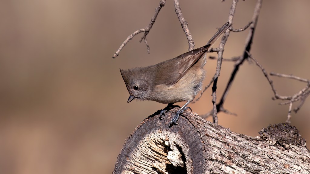 The Oak Titmouse (Baeolophus inornatus) is a small, non-migratory bird species native to the oak woodlands of California’s Central Valley. These birds are known for their distinctive gray-brown plumage and prominent black eyes. They also have a small crest on their head which they can raise or lower depending on their mood.