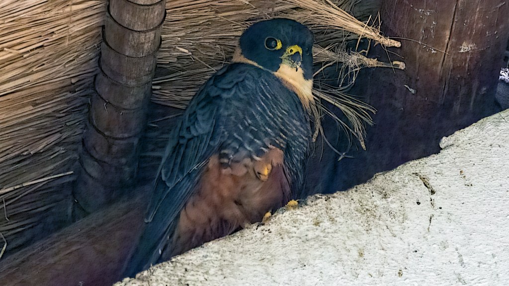 The Bat Falcon typically nests in tree cavities or on cliff ledges, and will lay a clutch of 2-4 eggs. Both parents will take turns incubating the eggs and caring for the young. In Belize, the breeding season for Bat Falcons typically begins in March and lasts through July.