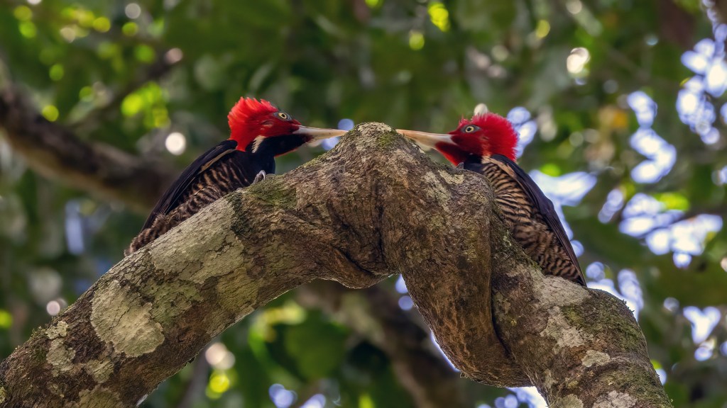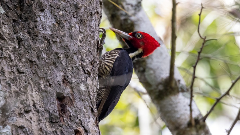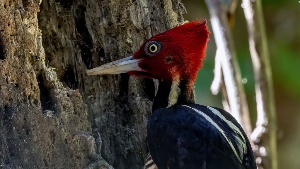 The Pale-billed Woodpecker is a bird of mature, lowland forests and prefers areas with large trees and abundant dead wood. Its diet consists mainly of insects, especially beetles, which it finds by hammering and excavating holes in trees with its powerful bill. The species is also known for its distinctive drumming, a loud and sustained series of knocks that can be heard from a distance.