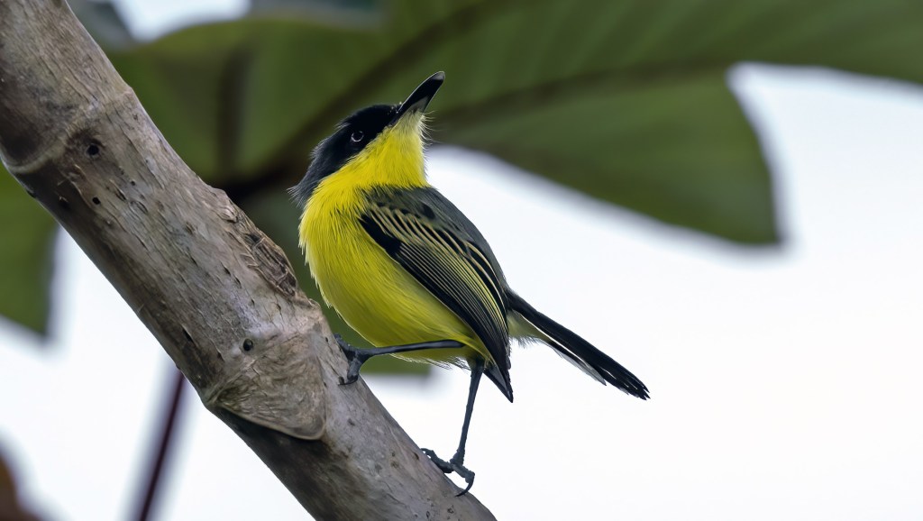 The Common Tody-Flycatcher (Todirostrum cinereum) is a small bird that can be found in Belize and other parts of Central and South America. They have a distinctive black head, dark back and wings, with a yellow throat and breast. Their beak is short and thin, perfect for catching insects, which make up the bulk of their diet.