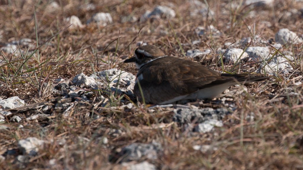 Killdeers are ground-nesting birds and create their nests in open, gravelly areas with minimal vegetation, such as riverbanks, shores, gravel bars, or even parking lots. Their nests are shallow depressions in the ground, lined with small rocks, twigs, or grass. One interesting behavior of the Killdeer is its “broken-wing” display, where it feigns injury to distract potential predators away from the nest or young. This behavior is a clever tactic to lead predators away from the vulnerable nest or chicks.