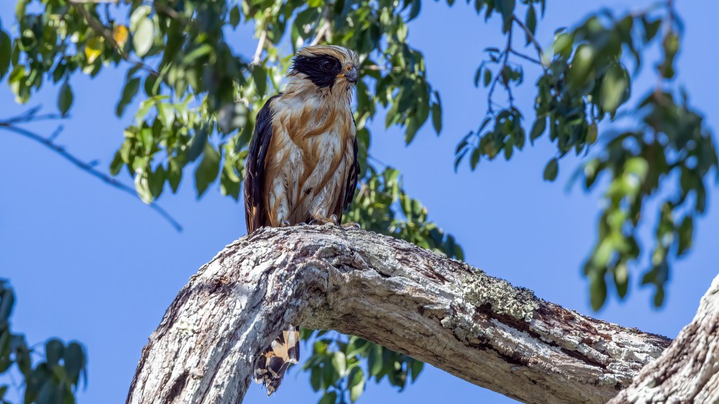The Laughing Falcon (Herpetotheres cachinnans) is a medium-sized bird of prey that is found throughout Mexico, Central America and South America, including Belize. This species is easily recognized by its distinctive call, which sounds like a raucous laugh. The Laughing Falcon has a striking plumage that contrasts buffy white head, neck, and underparts with a brown back and a black face mask and collar.