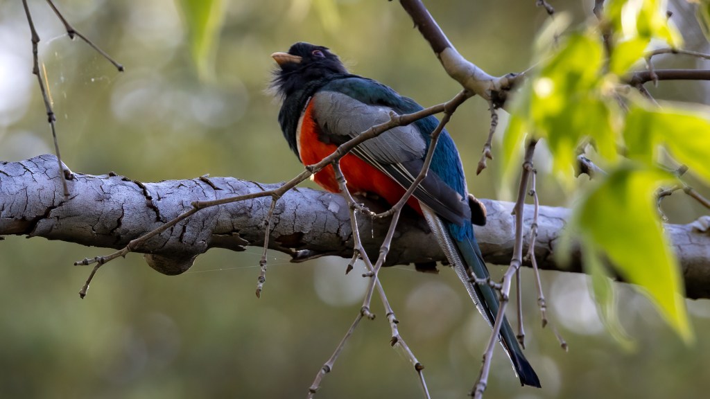 A wide range of insects, particularly large ones like katydids, cicadas, walkingsticks, and huge caterpillars, are consumed by the Elegant Trogon during its feeding period. Additionally, it eats little lizards. The trogon consumes a variety of other tiny fruits and berries, particularly in the late summer and early fall, including chokecherry and wild grape.