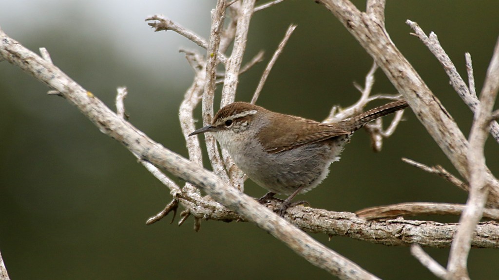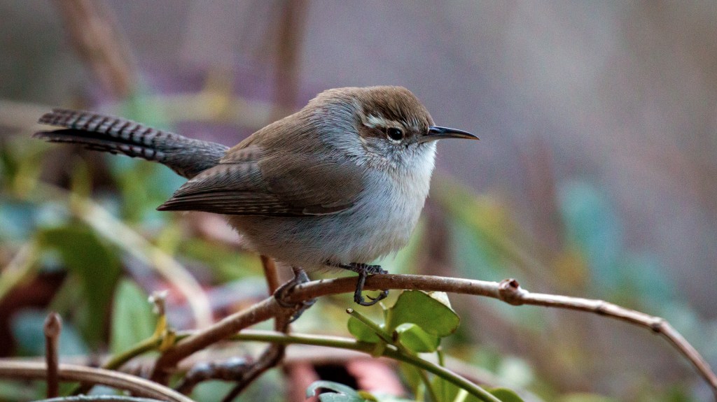 The Bewick’s Wren (Thryomanes bewickii) is a small, brown bird that is common in the Central Valley of California. They have a distinctive appearance, with a long, thin bill, a brownish-gray back, and a cream-colored belly. They also have a distinctive white eyebrow stripe above their eyes and a long tail that they often hold upright.
