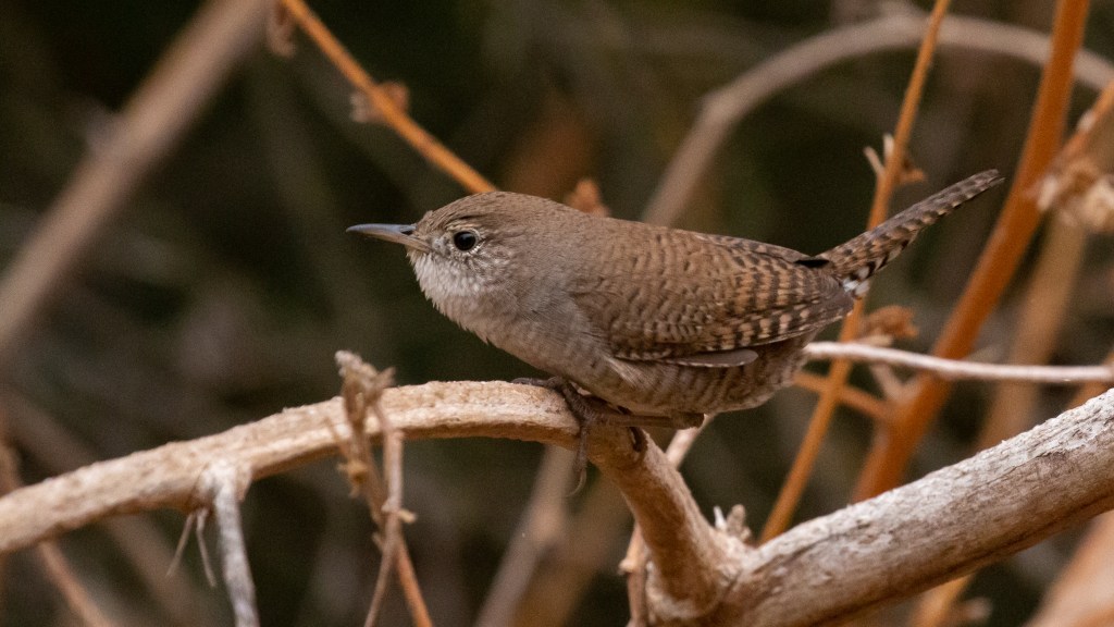 The House Wren (Troglodytes aedon) is a small, brown bird that is commonly found in the Central Valley of California. It has a round body with barred wings and short tail. The male and female birds look very similar, with the males being slightly larger and having a louder and more complex song.