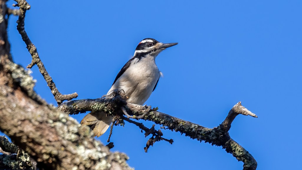 Natural History: The Hairy Woodpecker is a medium-sized woodpecker, measuring about 9 to 10 inches (23-25 cm) in length. It has a black and white patterned plumage, with a white undersurface, upperparts black with bold white stripe down center of back; wings black, variably spotted with white; and tail black with white outer rectrices. Males and females are similar in appearance, although males may have a red patch on the back of their heads. The species is named for the long, hair-like feathers on its crown and nape.