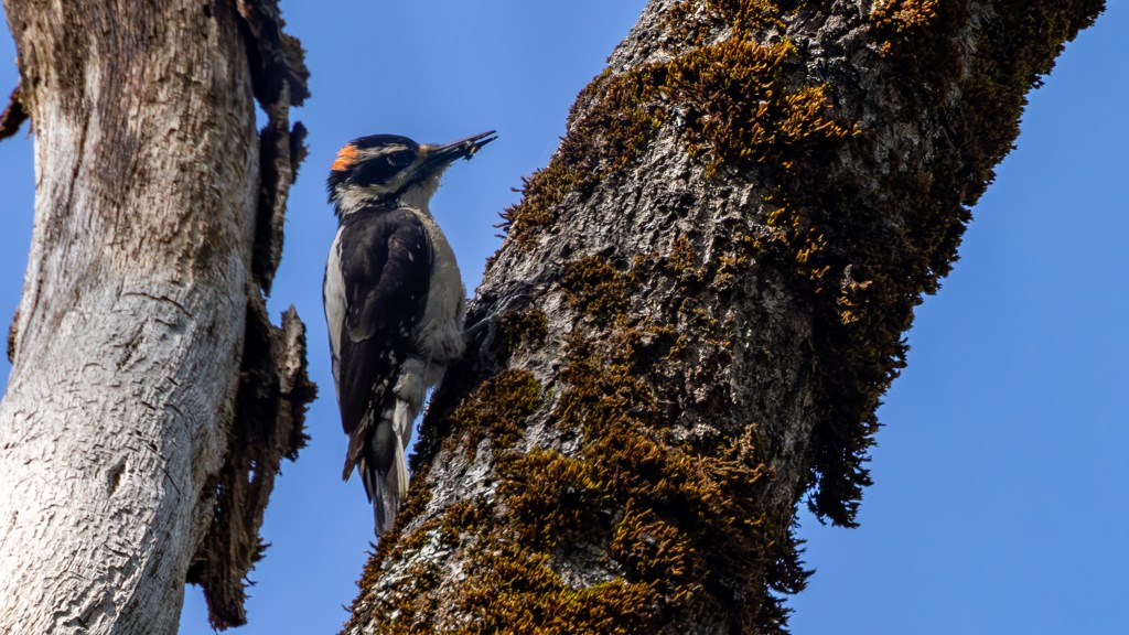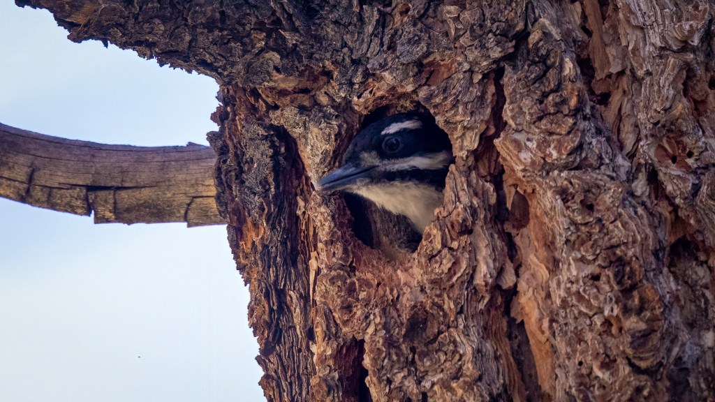 Nesting Preferences: Hairy Woodpeckers typically nest in cavities they excavate in dead or decaying trees. They often select snags (standing dead trees) or partially dead trees for nesting, which provide suitable soft wood for excavation. Nest cavities are lined with wood chips and can be reused in subsequent years. Both male and female birds participate in cavity excavation and incubation of the eggs.