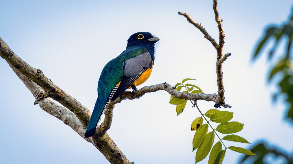 The Gartered Trogon is a stunning bird species found in Belize, which is located in Central America. These birds are known for their striking plumage, which features a bright yellow belly, green back, and black and white striped tails. The males and females are quite similar in appearance, although the females tend to have a slightly duller coloration.