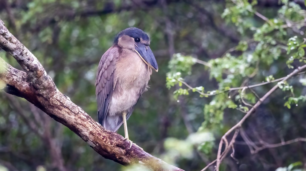 The Boat-billed Heron (Cochlearius cochlearius) is a unique bird species found in Belize and throughout much of Central and South America. This medium-sized heron is easily recognized by its large, boat-shaped bill, which is wider and flatter than those of other heron species. The forehead and cheeks are white. The eyes are huge and bulge out. The upper back is black, the rest of the back and upper wings are grey.