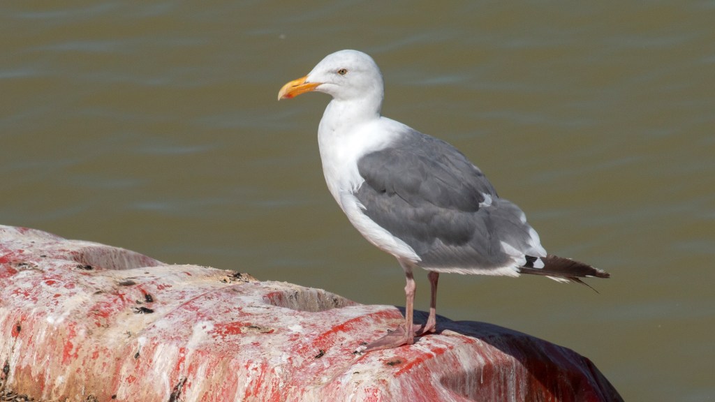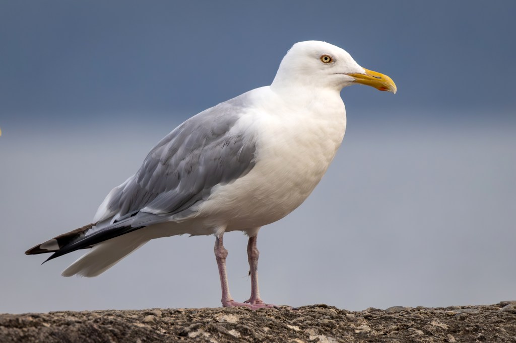 Herring Gull adults are white with a gray back and wings, black wingtips with white spots, and pink legs. Young birds take four years to reach fully adult plumage. During this time they go through several plumage stages and can be very variable in appearance.