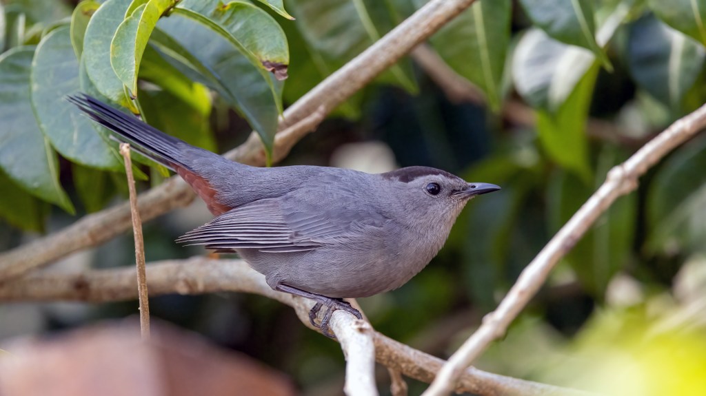 The Gray Catbird is a medium-sized songbird with a long tail and a rounded head. It has a slate-gray body and black cap. The undertail coverts are rust-colored, and the bill is black. The bird’s most distinctive feature is its call, which sounds like a cat’s meow.