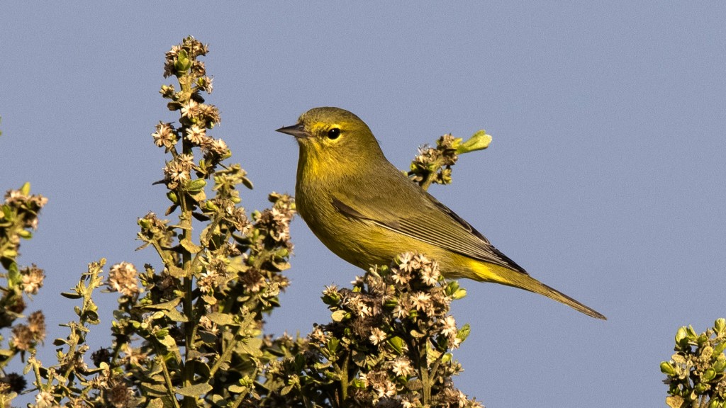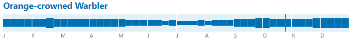 The Orange-crowned Warbler is more readily encountered as a Fairly Common Winter Visitor, but is also an Uncommon Visitor in summer in the Central Valley and can be found in wet areas with thick, tangled vegetation.
