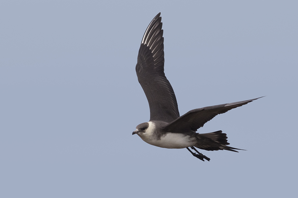 The Parasitic Jaeger (Stercorarius parasiticus) is a seabird known for its striking physical characteristics. It has a sleek and agile appearance with long, pointed wings and a deeply forked tail. Its plumage varies depending on age and season; adults typically exhibit a dark gray to blackish upperparts and a white underside, while juveniles have more mottled and brownish plumage. Parasitic Jaegers have distinctive white wing flashes, which are conspicuous in flight and help in their identification.