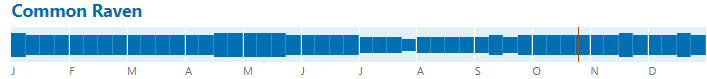 This large, black, majestic bird is geographically and ecologically one of the most widespread naturally occurring birds in the world. It is distributed throughout major portions of North America, Europe, Asia, and North Africa, and in all terrestrial biomes except tropical rain forests. The Common Raven is a Common Yearround Resident in California’s Central Valley and can be seen flying over any habitat, but is more frequently encountered closer to the foothills on each side of the valley.