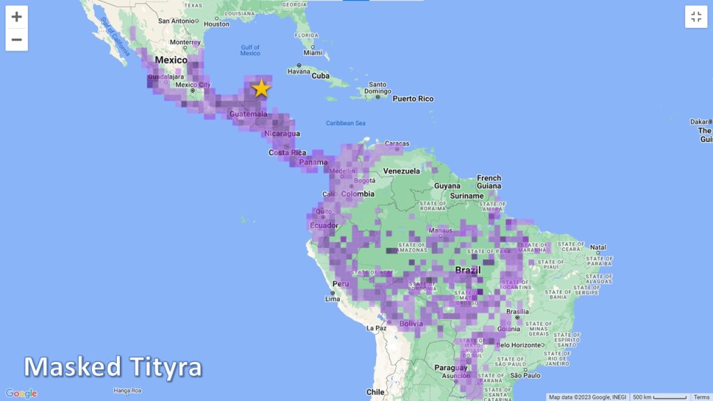 PHOTOS TAKEN: We saw and heard Masked Tityras at Chunyaxché, but were not able to photograph them. I did see them more times and got decent photographs in Yucatan, Campeche and in Belize at Pook’s Hill.