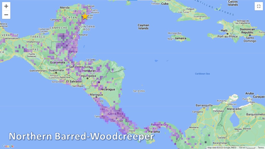 Lifer #665 Northern Barred-Woodcreeper. After focusing intently on trying (successfully!) to get photographs of the Yucatan Jays, I noticed this large woodcreeper swoop in on the tree right next to me. It landed in pretty good mixed sunlight and I was able to clearly see its striped neck and chest. Later more of them joined in the feeding frenzy surrounding the ant swarm.