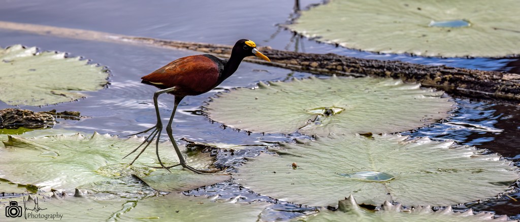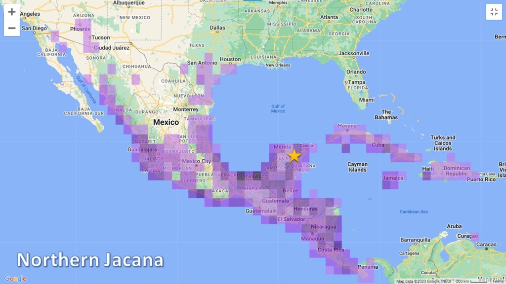 DETAILS ABOUT SIGHTING: Maria and I arrived early to the Cobá Archeological Zone with hopes of avoiding large crowds. The lagoon was quiet and peaceful when we arrived. We birded around the edge of the lagoon briefly as we waited for the ruins to open. I saw a Gray-crowned Yellowthroat, Least Grebe, Limpkin and Snail Kite. All interesting birds, but not lifers. After touring the ruins for a couple of hours (6 LIFERS!) we had lunch at the restaurant, Maria washed her hands and left her binoculars there (ugh…) and I went for a walk along the edge of the lagoon. I almost immediately spotted a single Northern Jacana scoot across the tops of the lily pads. I snagged one shot of it in partial flight showing its yellow underwing linings. It was then joined by 3 immature birds and another adult. I ended up seeing Northern Jacanas amny times in Mexico, Belize and Guatemala.
