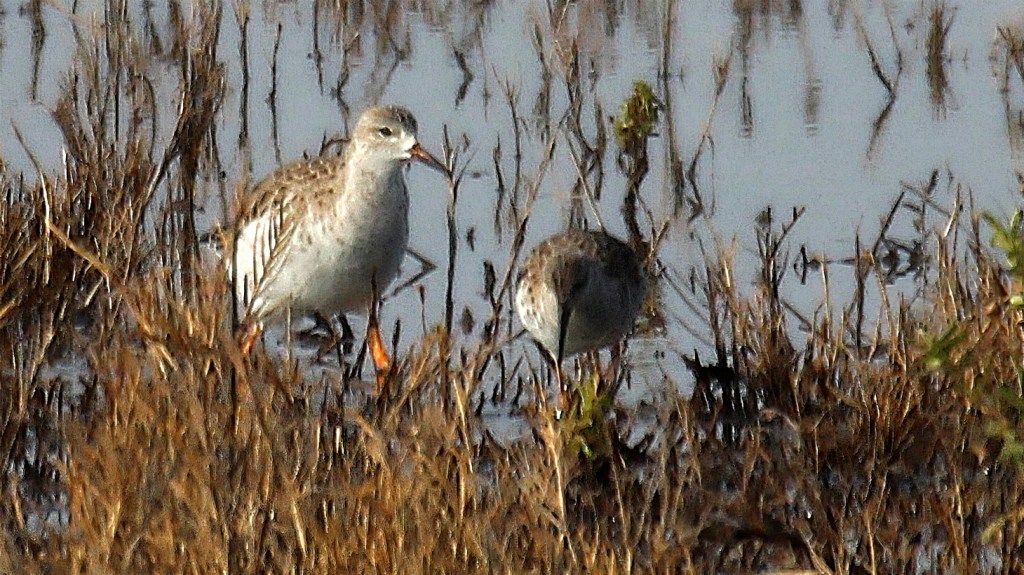 The Ruff exhibits sexual dimorphism, with males and females displaying different plumage during the breeding season. Males have a striking appearance, with a ruff of elongated feathers around their necks, which they can puff up to attract females. Their plumage varies, with some males sporting a mix of black, white, and reddish-brown colors. Females and non-breeding males have more subdued plumage, typically brown or gray. Their legs are long and slender, adapted for wading in wetlands and marshes.
