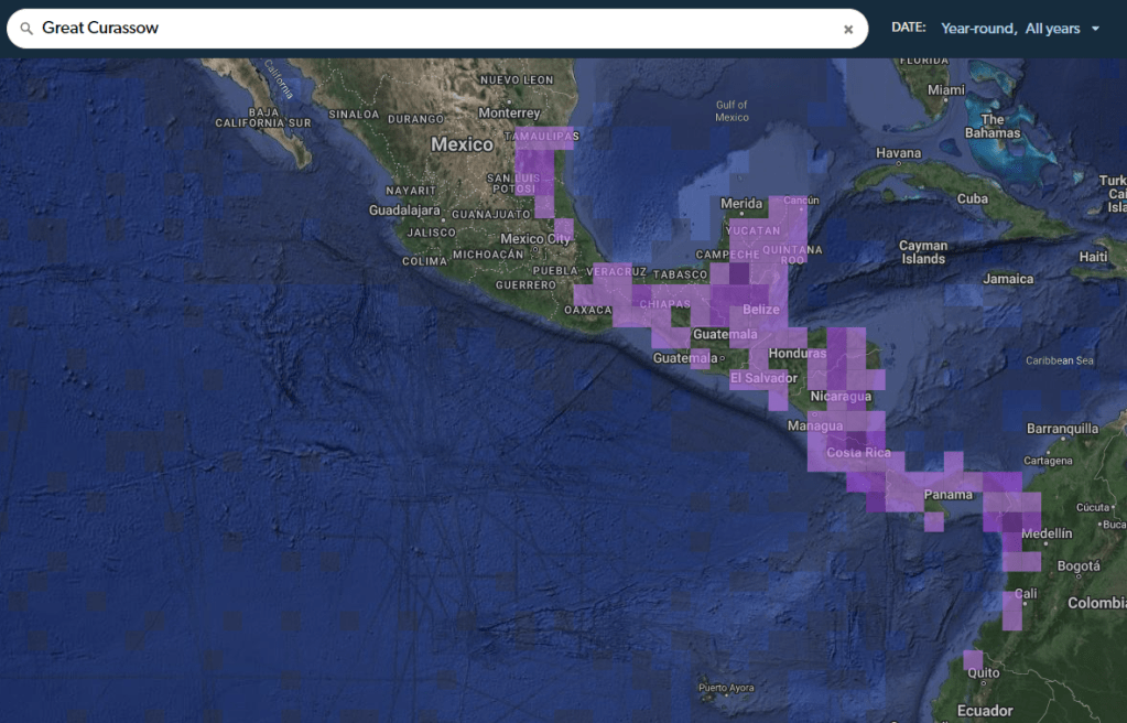 The Great Curassow (Crax rubra) inhabits undisturbed humid evergreen forests, as well as some seasonally dry forests and mangroves. Reports suggest that it can tolerate limited disturbance and may utilize secondary forests in areas where hunting is absent. This large, pheasant-like bird is distributed from eastern Mexico through Central America to western Colombia and northwest Ecuador, but it is rarely found except in protected parks or remote areas.