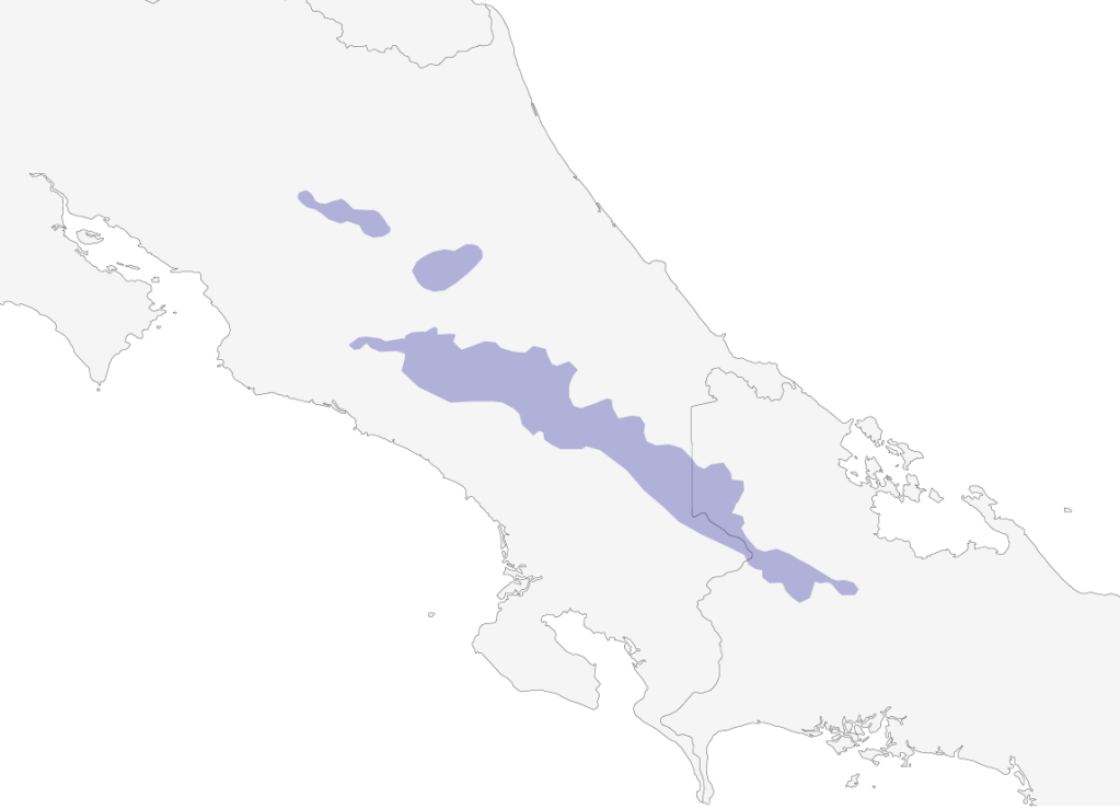 The Volcano Hummingbird is restricted to the Costa Rica and Panama Highlands Endemic Bird Area, where it is generally common in highland pastures and open grassland with scrub, usually above 2000 m elevation. This tiny hummingbird is mainly green above, with a brilliant wine-colored gorget in the male (replaced by dark spotting in the female), a white breast band, and greenish (males) or pale rufous (females) over the rest of the underparts. The tail is slightly forked in both sexes, more noticeably so in males. (from Birds of the World)