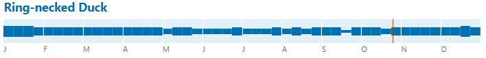 The Ring-necked Duck is a Fairly Common Winter Visitor and Rare Summer Visitor in California’s Central Valley and can be found in Open Water habitats.