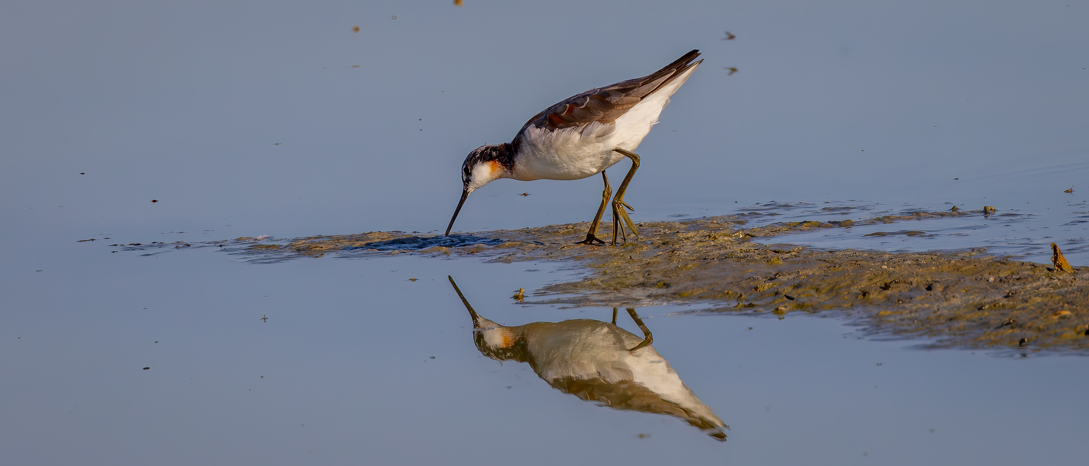 Natural history reveals a bird of elegant contradictions. Though classified as a shorebird, Wilson’s Phalarope behaves more like a waterbird—swimming buoyantly, spinning to feed, and nesting in upland grasslands near shallow wetlands. Its mating system is polyandrous: females are larger, more brightly colored, and compete for mates, while males incubate the eggs and care for the young. During migration, both sexes undergo a complete molt and accumulate fat reserves for their transcontinental journey to South America. In the Central Valley, their brief but vivid presence offers a glimpse into one of the most unusual life histories in the shorebird world.