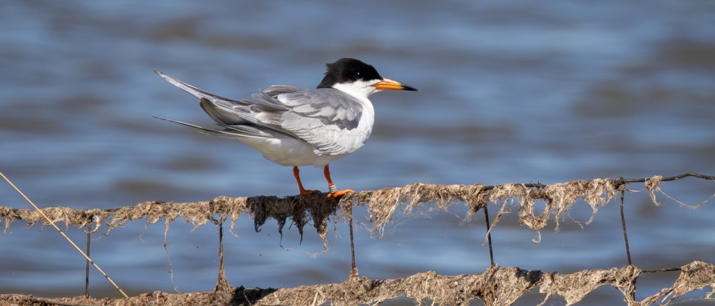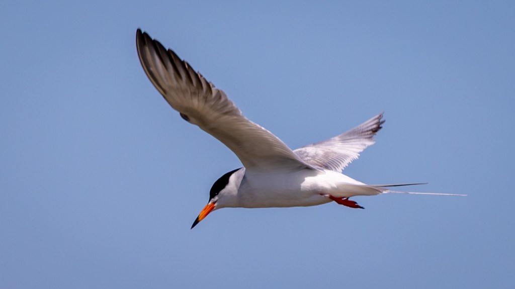 PHYSICAL DESCRIPTION – Forster’s Tern is a sleek, medium-sized tern with a sharp orange bill tipped in black, pale gray upperparts, and a deeply forked tail that flashes white in flight. In breeding plumage, it sports a black cap and bright white underparts, while in winter, the cap recedes to a dark eye patch on a white head.