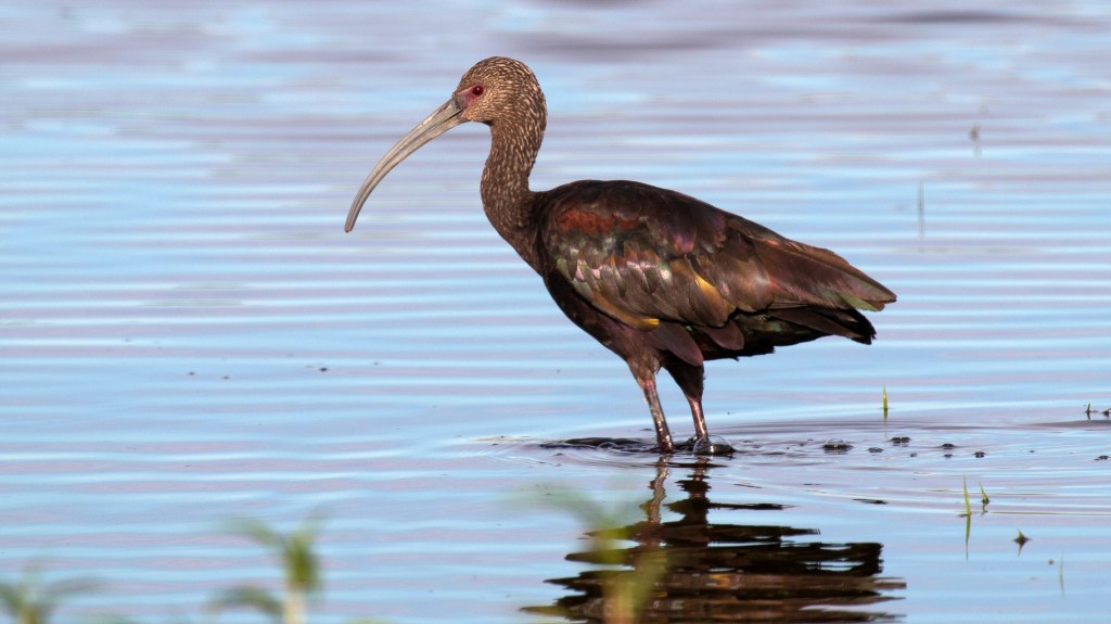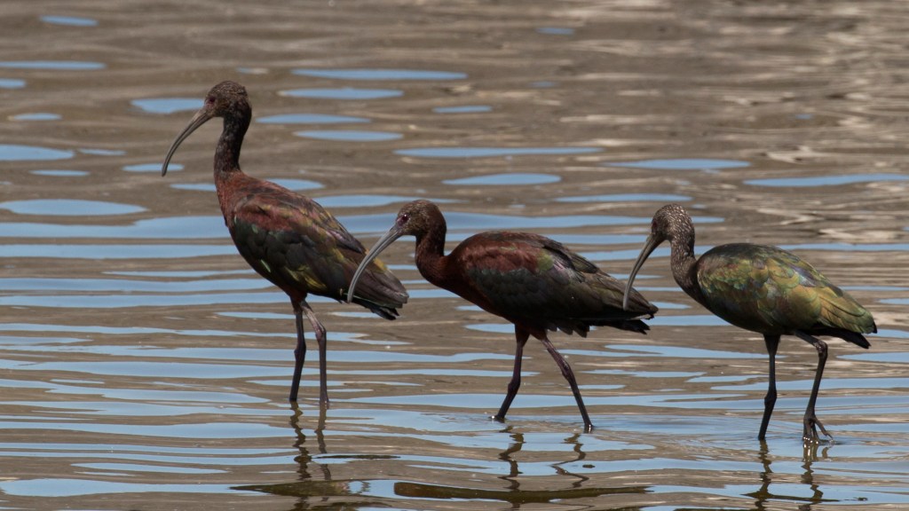 DISTRIBUTION AND STATUS IN CALIFORNIA’S CENTRAL VALLEY – The White-faced Ibis (Plegadis chihi) is widespread and locally abundant in California’s Central Valley, especially during the breeding season, favoring flooded fields, managed wetlands, and rice paddies throughout the Sacramento and San Joaquin valleys. It is commonly seen in flocks probing soft mud for invertebrates, and nests colonially in dense emergent vegetation such as tules and cattails. The species is listed as Least Concern by the IUCN, with a stable population overall, though its reliance on wetland habitats makes it vulnerable to changes in water availability and land use. Natural history observations highlight its iridescent plumage, long decurved bill, and seasonal movements, with breeding peaking in late spring and post-breeding dispersal extending into early fall.