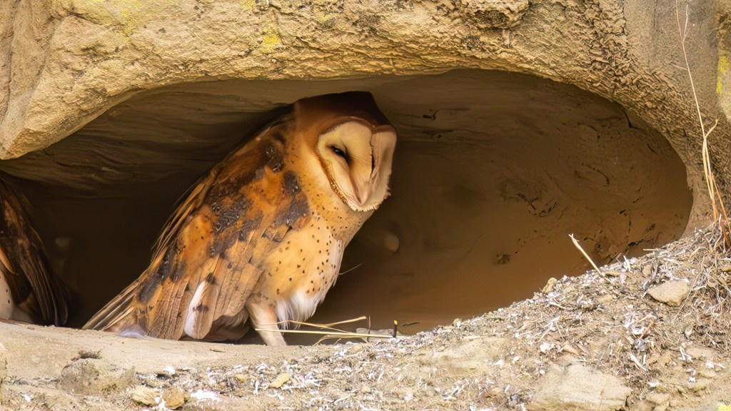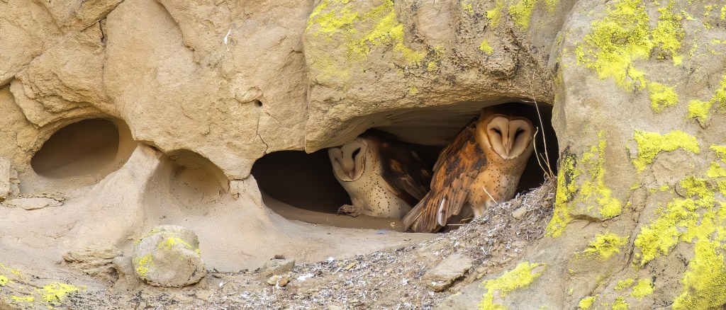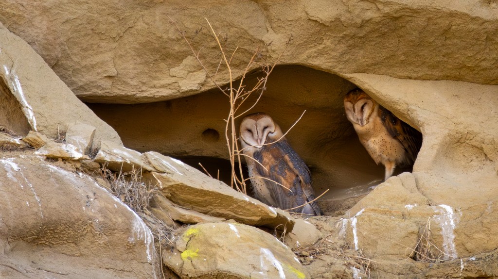 THE AMERICAN BARN OWL MOMENT – Clearly the biggest challenge for my Photographic Big Year in Stanislaus County for 2025 was/is to photograph the nocturnal birds. I had American Barn Owls fly over my house multiple times with their screeches and bill-clicking and I’ve seen them on fenceposts and telephone poles while driving at night, but I was never able to successfully snap a photo of one. Then I read a report that they were visible DURING THE DAY at the famous Owl Rock in Del Puerto Canyon. That next morning I was out the door running before dawn with high hopes of a successful hunt. As I rounded the corner looking for a spot to pull off, an American Barn Owl flew from the tree right to the creek side of the road and flew over to the cliff face. Fortunately that pointed me directly to their nest. Now, NO WORRIES about harassment as I was using a very high resolution camera with a 700 mm lens. After about 150 photos snapped, I was off, up the canyon hoping for additional feathered subjects.
